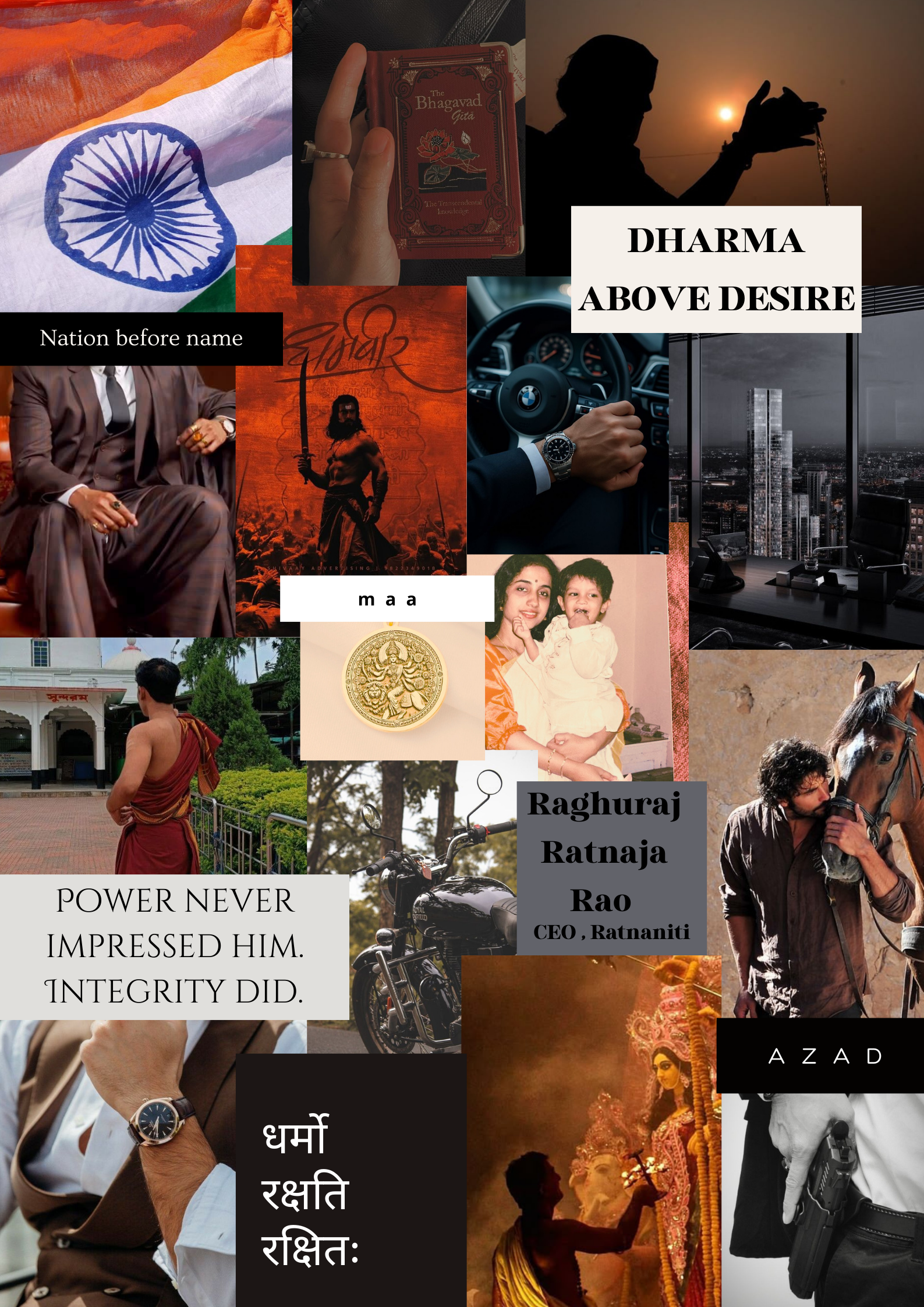 Raghuraj Ratnaja Rao looks calm from a distance, but up close he’s all steel. A man who built himself from ruins, shaped by his mother’s teachings and the loss that changed him forever. By day, he’s a successful businessman. By truth, he’s Azad a patriot who’ll do whatever it takes to protect his nation. He doesn’t talk much, doesn’t trust easily, and doesn’t bend when it comes to dharma. Anger in his blood, discipline in his bones, and a softness he hides like a secret wound. He’s the kind of man who stands in the right place even when it looks wrong. Quiet, fierce, controlled. A storm in perfect balance.